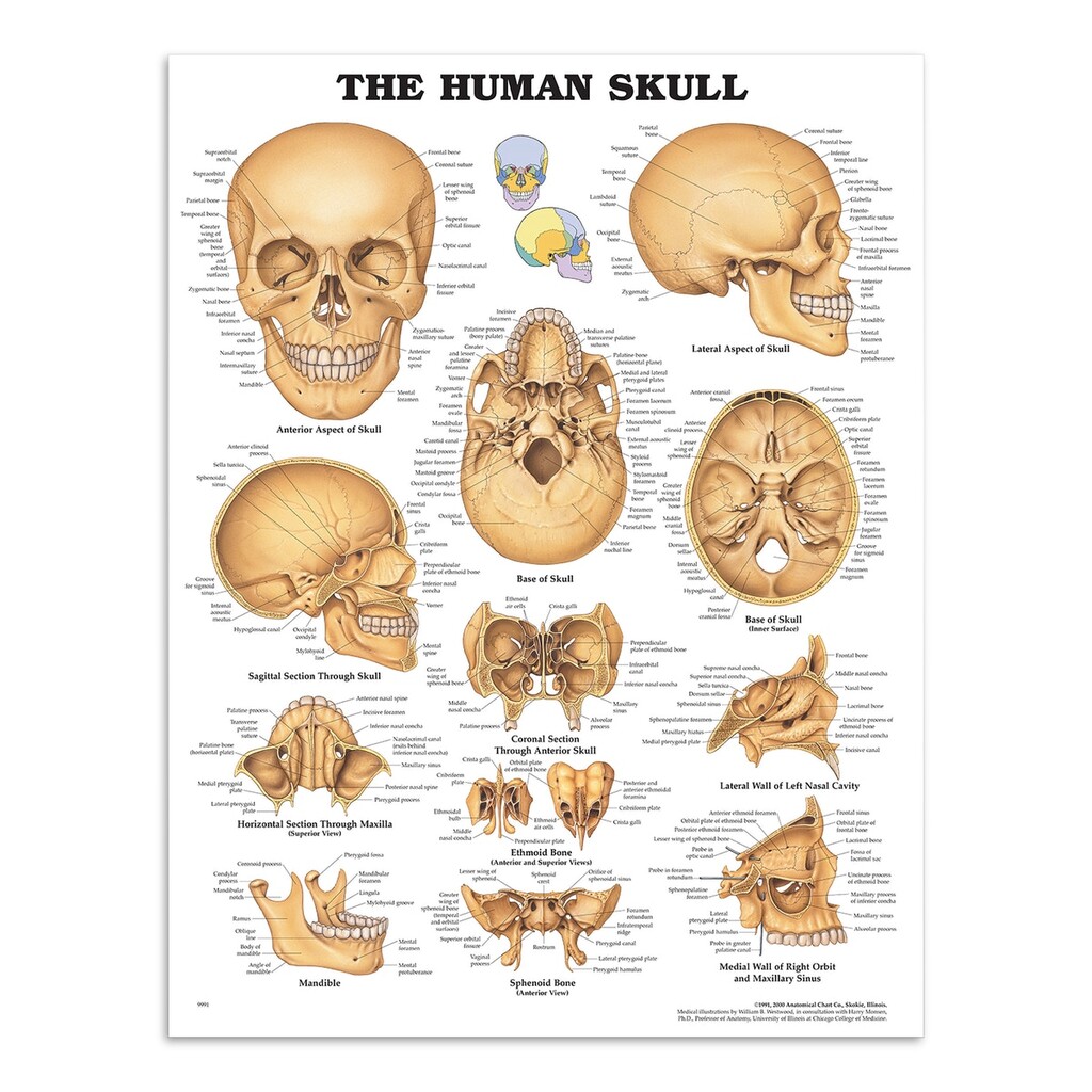 Attēlā redzams galvaskausa priekšējais un sānu skats. Ilustrē galvaskausa pamatni (ieskaitot iekšējo virsmu), sagitālo griezumu caur galvaskausu.