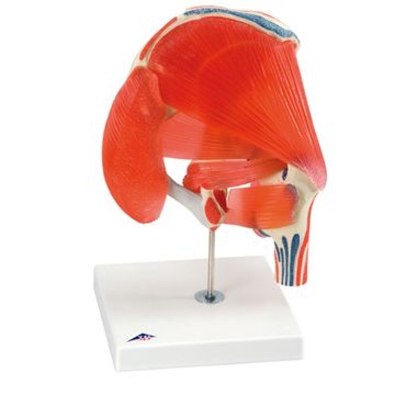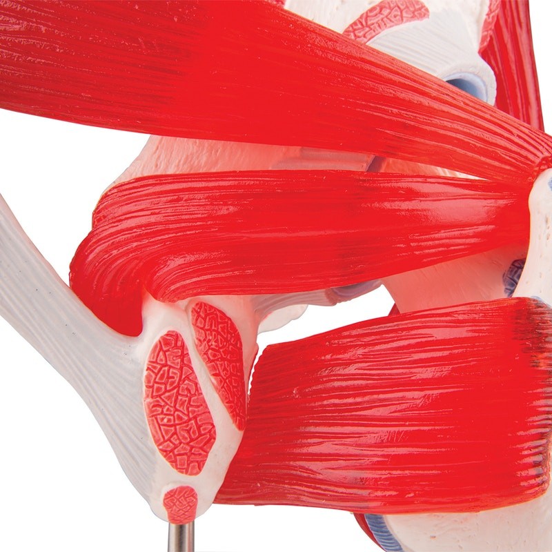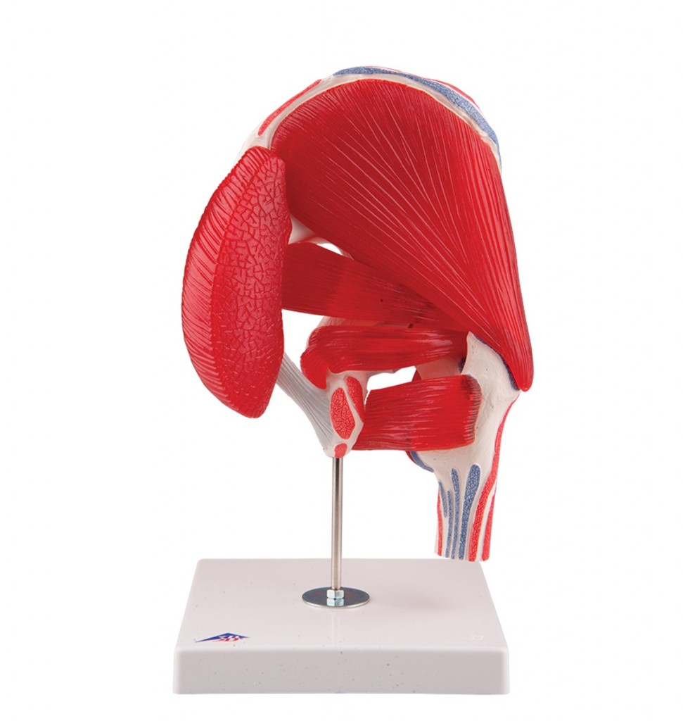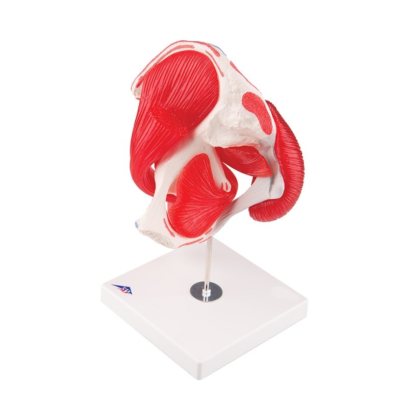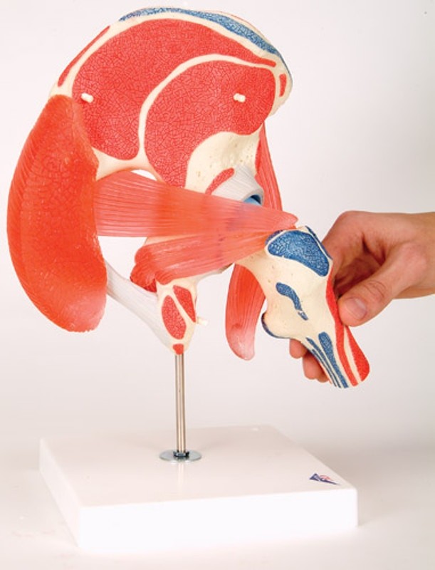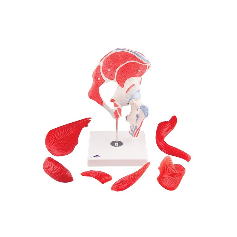 Modelī redzama vīrieša labā gūžas locītava ar atsevišķiem muskuļiem, kā arī muskuļu izcelsmi un piestiprinājumiem augšstilba kaulā un gūžas kaulā. Izglītības nolūkos muskuļu izcelsme ir izcelta un attēlota krāsaini (muskuļa izcelsme = sarkana, muskuļa stiprinājums = zila). Gūžas muskuļi ir piestiprināti pie atbilstošās izcelsmes un stiprinājuma vietas, tāpēc tos var noņemt.
