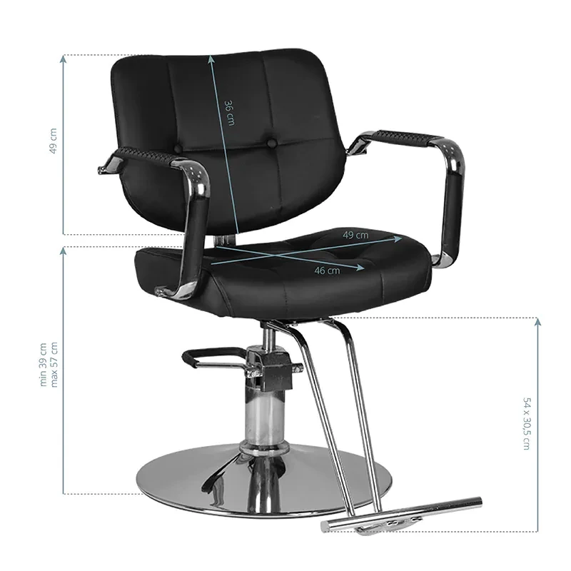 Moderns friziera krēsls ar modernu dizainu. Ļoti ērts, ideāli piemērots mūsdienīgiem saloniem. Īpaši izstrādāts, lai klientam procedūras laikā nodrošinātu ērtu pozīciju. Regulējams vertikālā plaknē. Ļoti stabils un izturīgs. Apdare izgatavota no augstas kvalitātes eko ādas. Melnā krāsā.